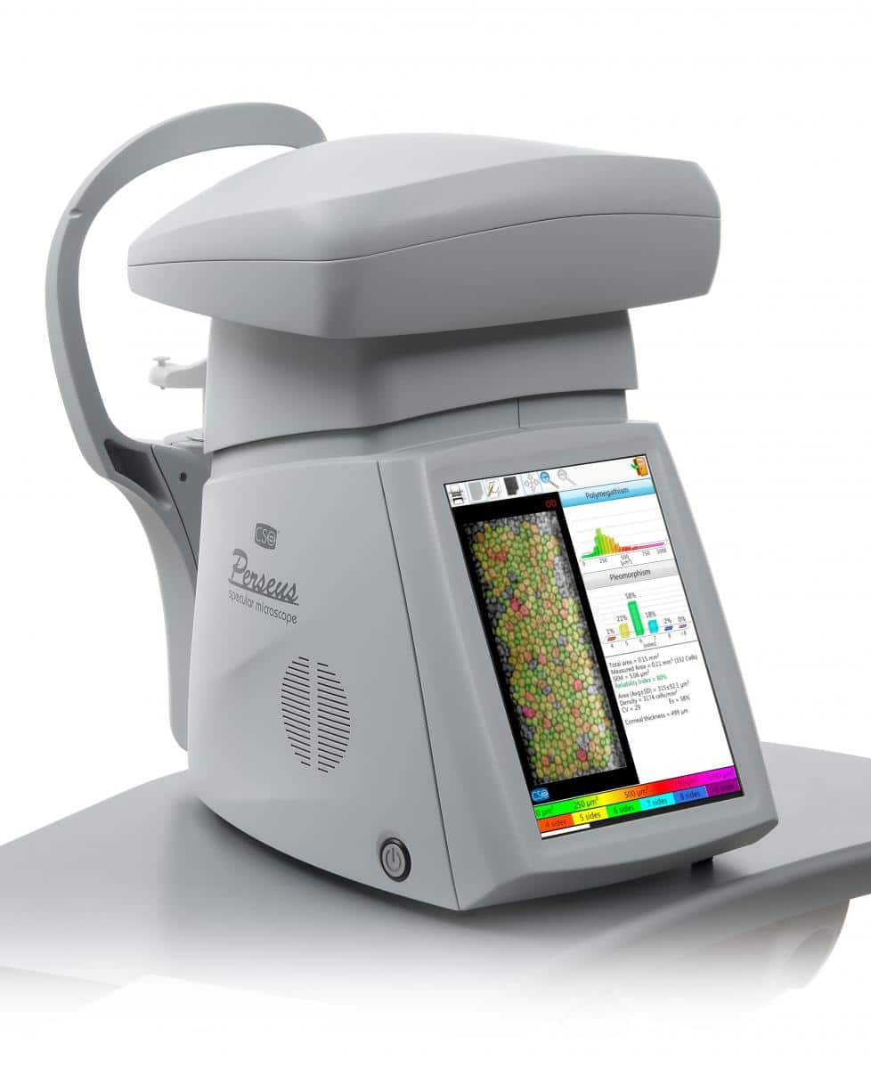 La microscopía endotelial es esencial en el diagnóstico de muchas distrofias corneales, enfermedades degenerativas y en la evaluación pre y postoperatoria de cirugía de cataratas y trasplantes de córnea. Perseus es un instrumento sin contacto totalmente automatizado que proporciona análisis del endotelio corneal: el dispositivo produce rápidamente imágenes de alta definición, calidad y bien contrastadas. Los valores de densidad celular, pleomorfismo y poimegatismo, así como los datos paquimétricos, se calculan automáticamente. Si es necesario realizar evaluaciones en las áreas periféricas de la córnea, Perseus está equipado con un conjunto de objetivos de fijación que permiten realizar estas mediciones.