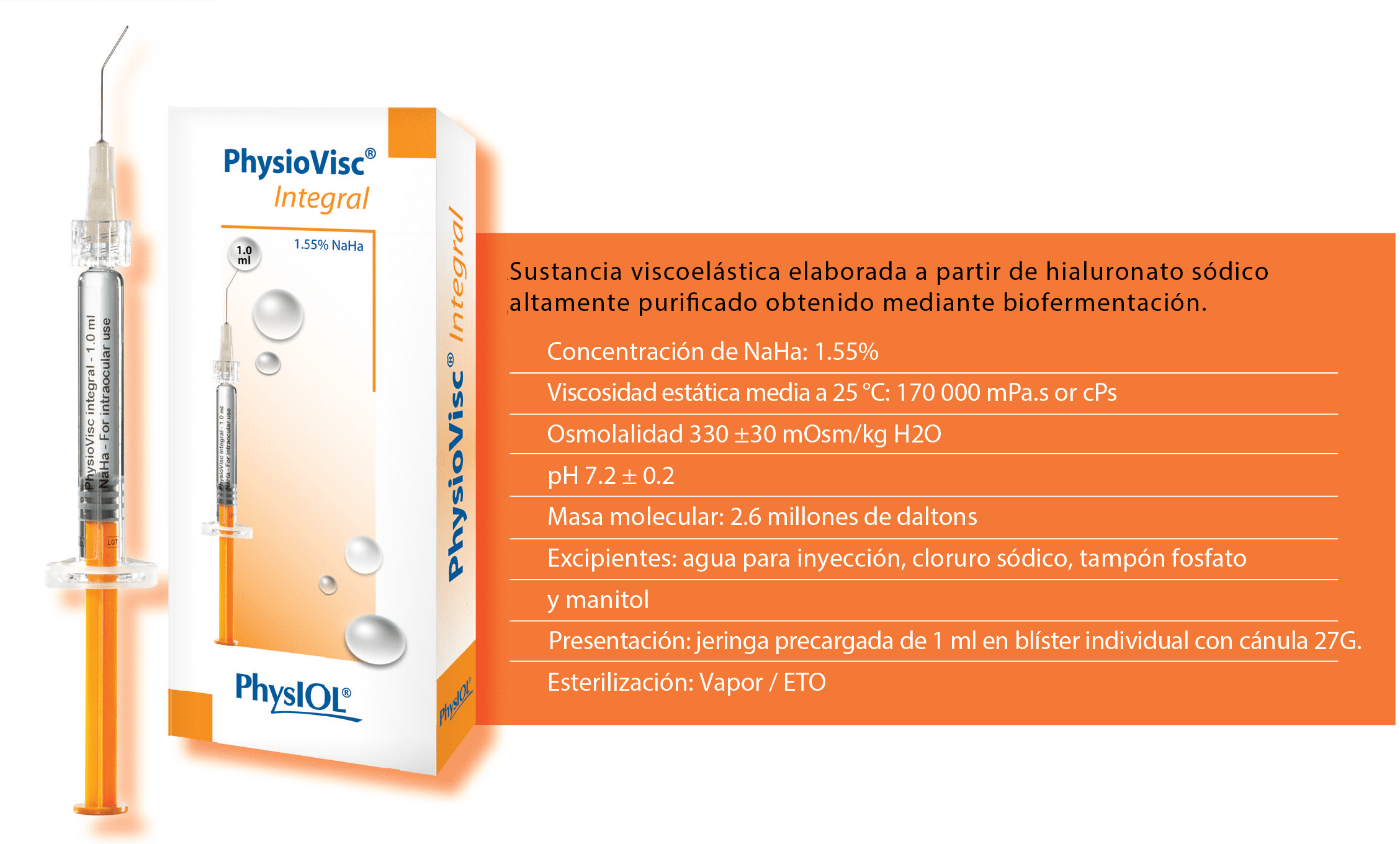 PhysioVisc® Integral es una solución sencilla, económica y eficaz para la cirugía facorrefractiva rutinaria. Fabricado a partir de hialuronato sódico producido mediante biofermentación, se suministra en una jeringa de 1 ml lista para usar y viene con una cánula fina de 27G.