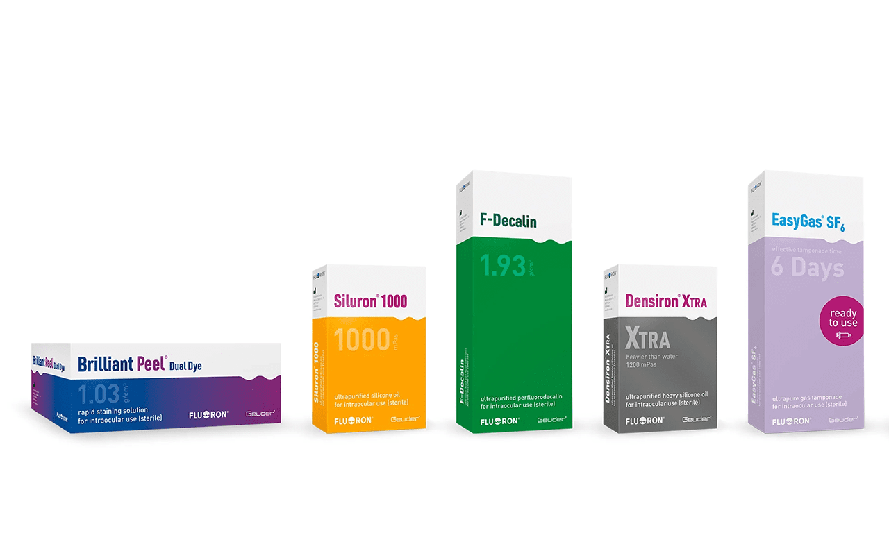Además de innovadores tamponamientos de aceite y gas de silicona que permanecen en el ojo durante un periodo más prolongado, Fluoron también produce perfluorocarbonos y alcanos semifluorados para uso intraoperatorio.